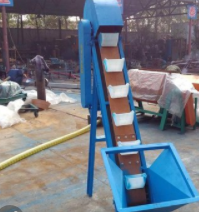 斗式提升機(jī)的輸送工作原理是:料斗把物料從下面的儲(chǔ)藏中舀起,隨著輸送帶或鏈提升到頂部,繞過頂輪后向下翻轉(zhuǎn), 斗式提升機(jī)將物料傾入接受槽內(nèi)。帶傳動(dòng)的斗式提升機(jī)的傳動(dòng)帶一般采用橡膠帶,裝在下或上面的傳動(dòng)滾筒和上下面的改向滾筒上。鏈傳動(dòng)的斗式提升機(jī)一般裝有兩條平行的傳動(dòng)鏈,上或下面有一對(duì)傳動(dòng)鏈輪,下或上面是一對(duì)改向鏈輪。斗式提升機(jī)一般都裝有機(jī)殼,以防止斗式提升機(jī)中粉塵飛揚(yáng)。