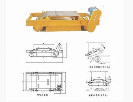 被皮帶輸送機輸送的散狀物料,通過安裝在尾部支架上的磁選機(即旋轉(zhuǎn)的直流磁鐵)時,物料中的鐵磁雜物被吸,由棄鐵膠帶將鐵磁雜物拽至電動滾筒卸下,達到自動除鐵的目的。
